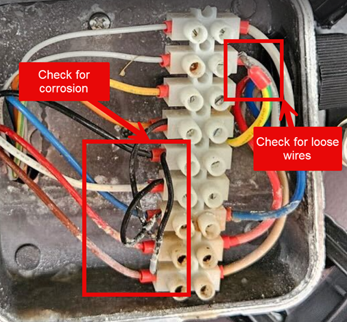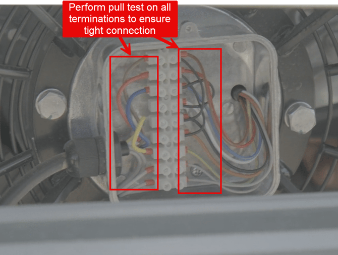 - Check cables from breaker to junction box and junction box to fan motor junction box for any visible damage. Crushed, cut, etc.