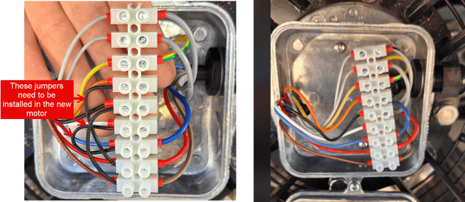 Take note of or photo of all wire connections and remove the wires connected to the motor. Be sure to note the jumper wire connections (small black wires).