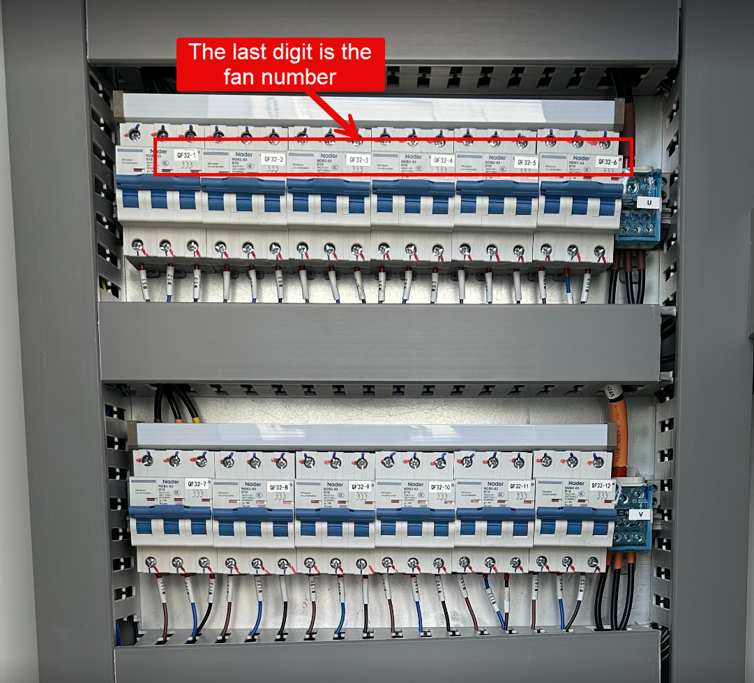 6) After physical inspection above is unsuccessful in discovering the root cause, follow document "Power Up an Aibox Container" and power up the container. Keep all PDUs off as well as all fans except the fan in question.