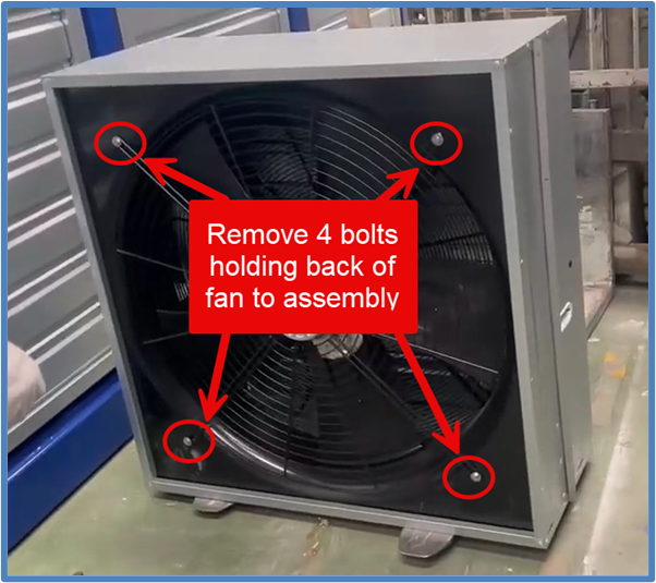 From inside the container, remove the (4) 13 mm bolts holding the protection cage. A second person will have to hold the nut (13 mm) from the outside of the container through the louvers. Be sure to keep track of all washers and hardware