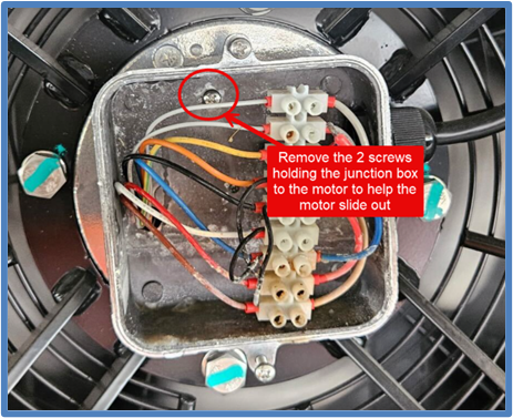 9) Remove the 2 screws holding the junction box to motor. This allows the motor to slide out easier as the junction box can be rotated now.