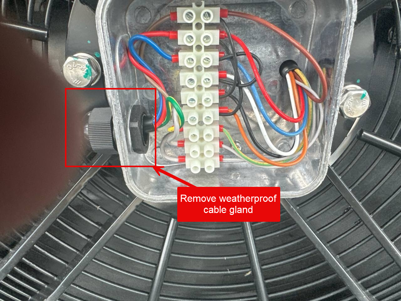 10) Remove the weatherproof cable gland using a crescent wrench or channel locks