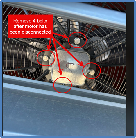 Remove the 4 bolts (17 mm) mounting the motor to the outside of the housing. Have a second person hold the motor from the inside while these bolts are removed. The motors are approximately 60 lbs. Remove the motor from the fan assembly.