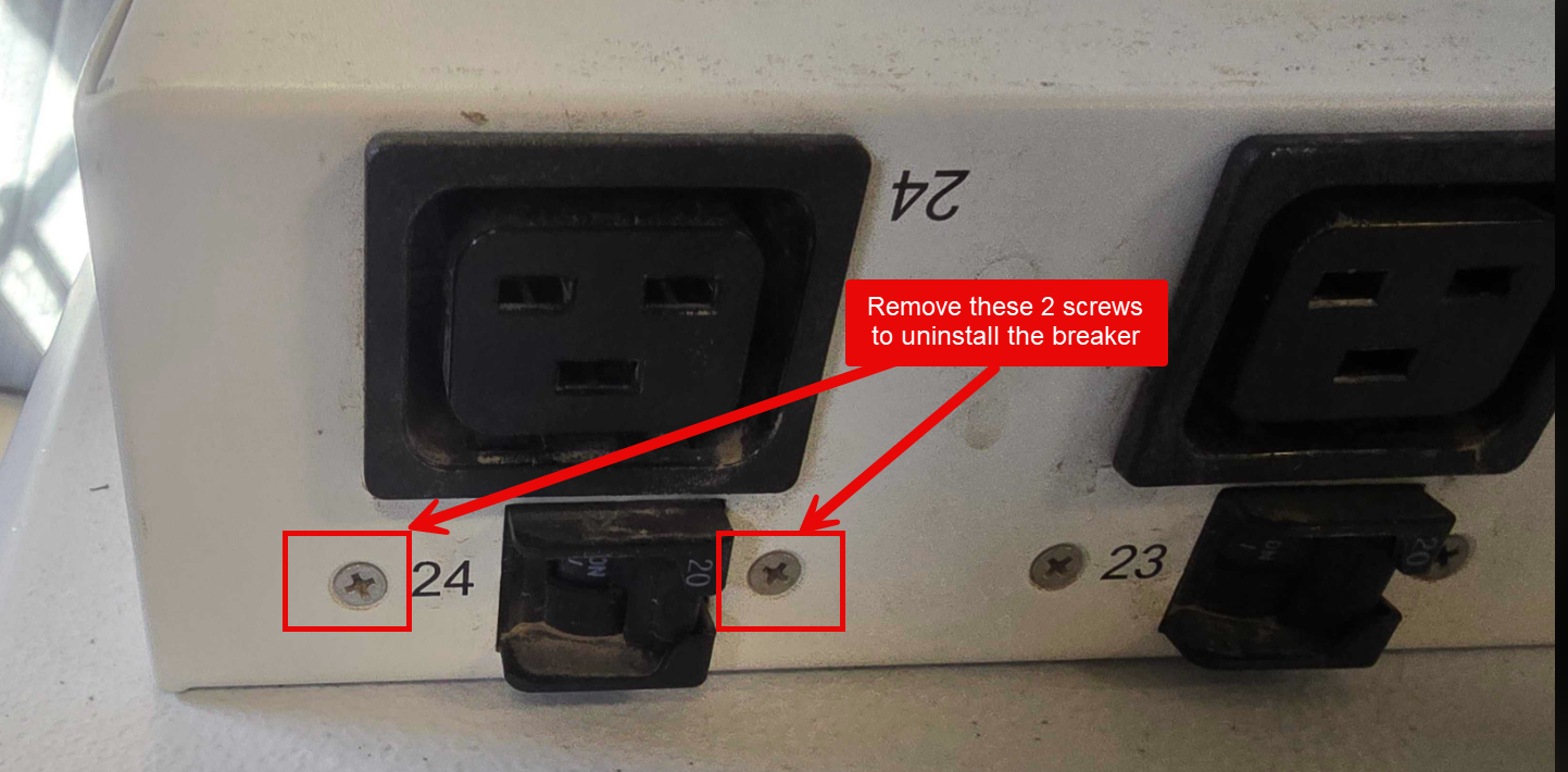 The process below is for removing good breakers/outlets from a PDU to keep spares on hand in case of any fried outlets or bad breakers. It is always best to keep one complete spare on site to swap while the breaker/outlet is being changed to minimize downtime.