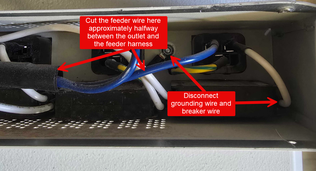 5) To remove the outlet, disconnect the grounding wire (the breaker wire was already disconnected in Step 5) and cut the feeder wire approximately halfway between the feeder harness and outlet. This will ensure it's easy to install a new outlet.